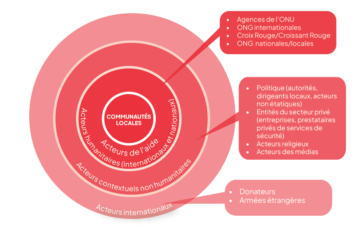 Un large éventail d’autres acteurs, notamment des entreprises, des groupes communautaires et des organisations de la société civile locale, peuvent également être présents dans le contexte opérationnel et apporter un éclairage et un soutien précieux. Il est important que les organisations humanitaires prennent en compte l’impact potentiel de leurs interventions et de leurs décisions en matière de sécurité sur ces acteurs.