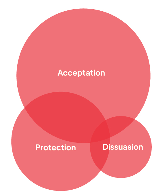 Les mesures d’acceptation sont souvent comprises comme la réduction ou l’élimination des menaces potentielles par le développement et le maintien de relations avec les parties prenantes concernées et l’obtention de leur « consentement » à opérer dans un lieu précis. En pratique, l’acceptation peut être plus judicieusement comprise comme un continuum, allant de l’acceptation (la plus sûre) au ciblage (la plus risquée). L’acceptation ne se présuppose pas ; elle doit être activement forgée et maintenue avec diligence. Les mesures d’ « acceptation active » comprennent l’approche stratégique d’un grande nombre d’acteurs et parties prenantes ; le développement des compétences du personnel en matière de relations et de communication sociales, politiques et interpersonnelles ; et la conception et la diffusion de messages clés concernant la mission, les objectifs et les programmes de l’organisation. Les mesures d’acceptation ne sont pas efficaces contre toutes les menaces ; c’est pourquoi une combinaison de mesures est souvent nécessaire dans le cadre d’une stratégie de sécurité.